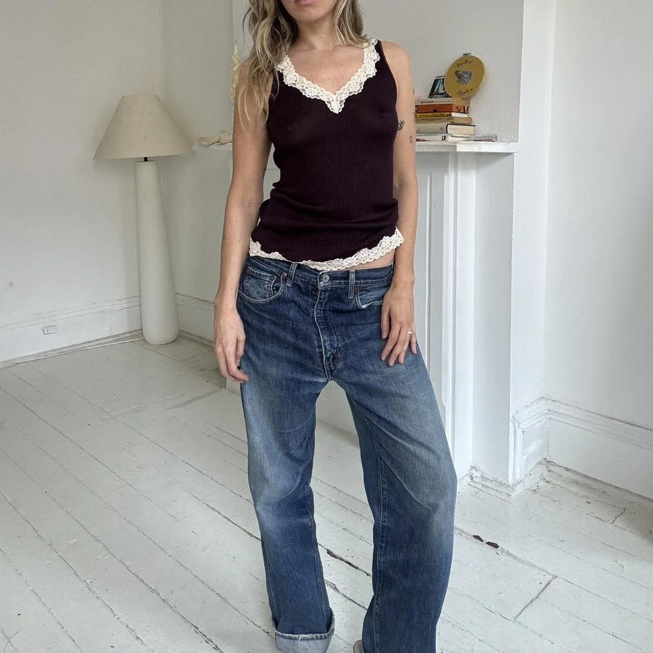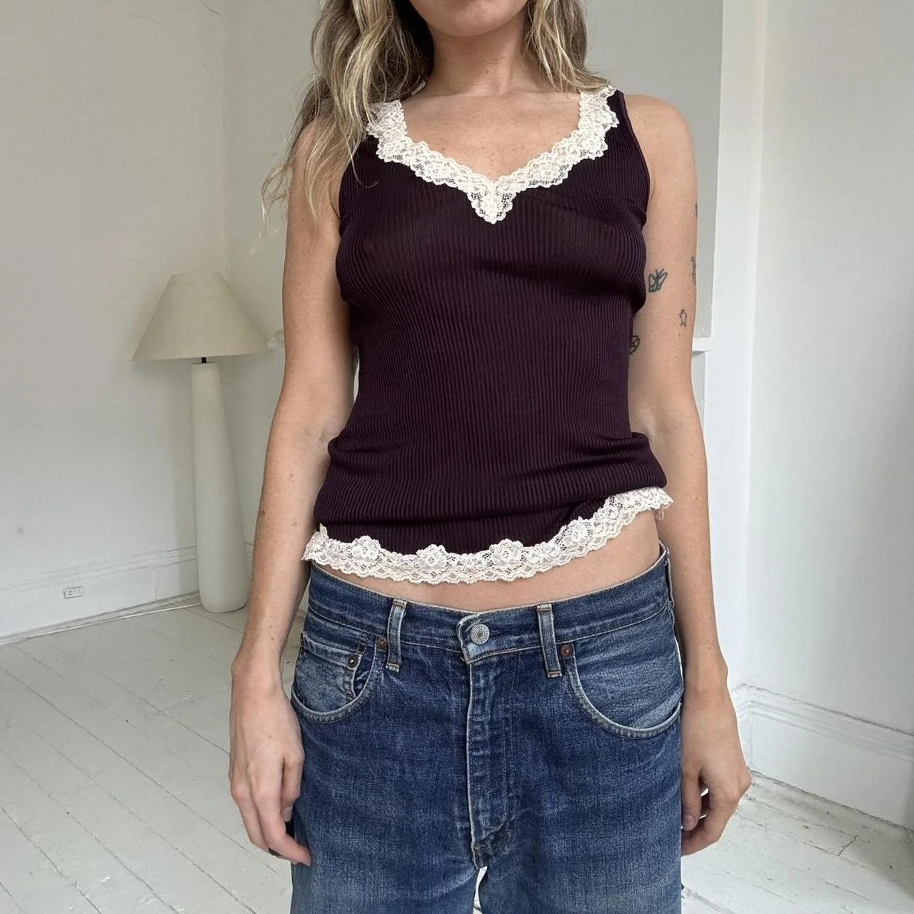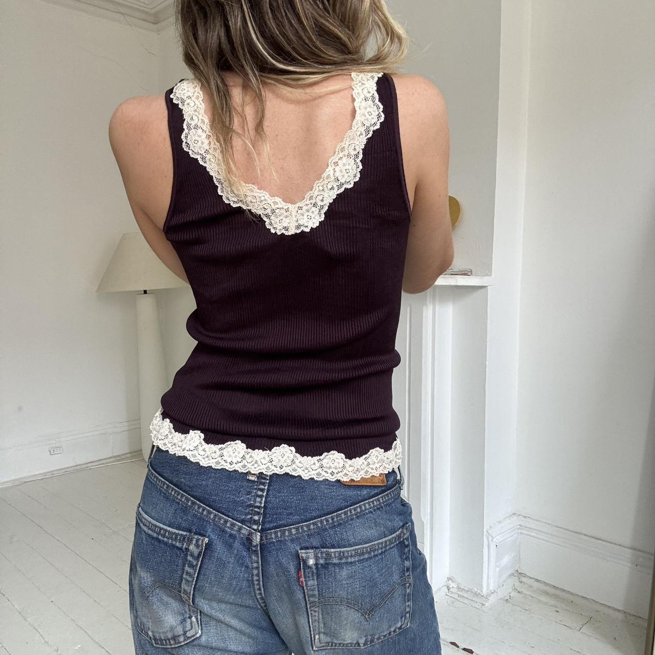 Silk lace edge 2000’s banana republic tank top, size L. Model is typically a size small and it fits as pictured. In brand new condition.