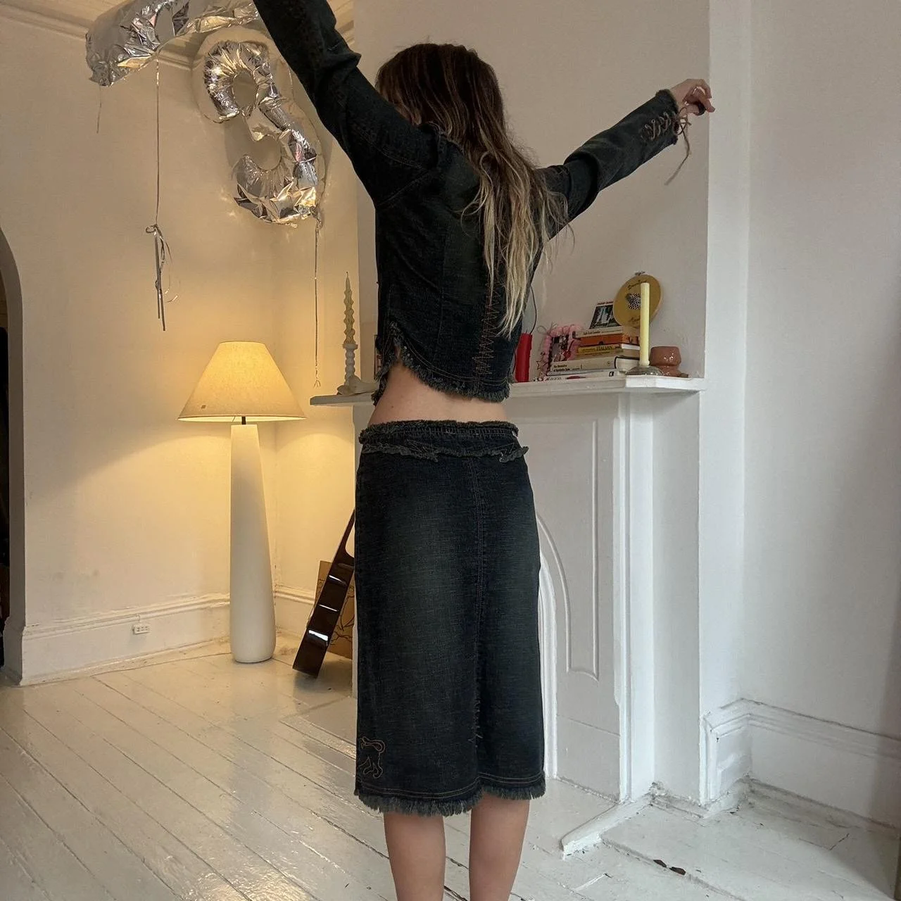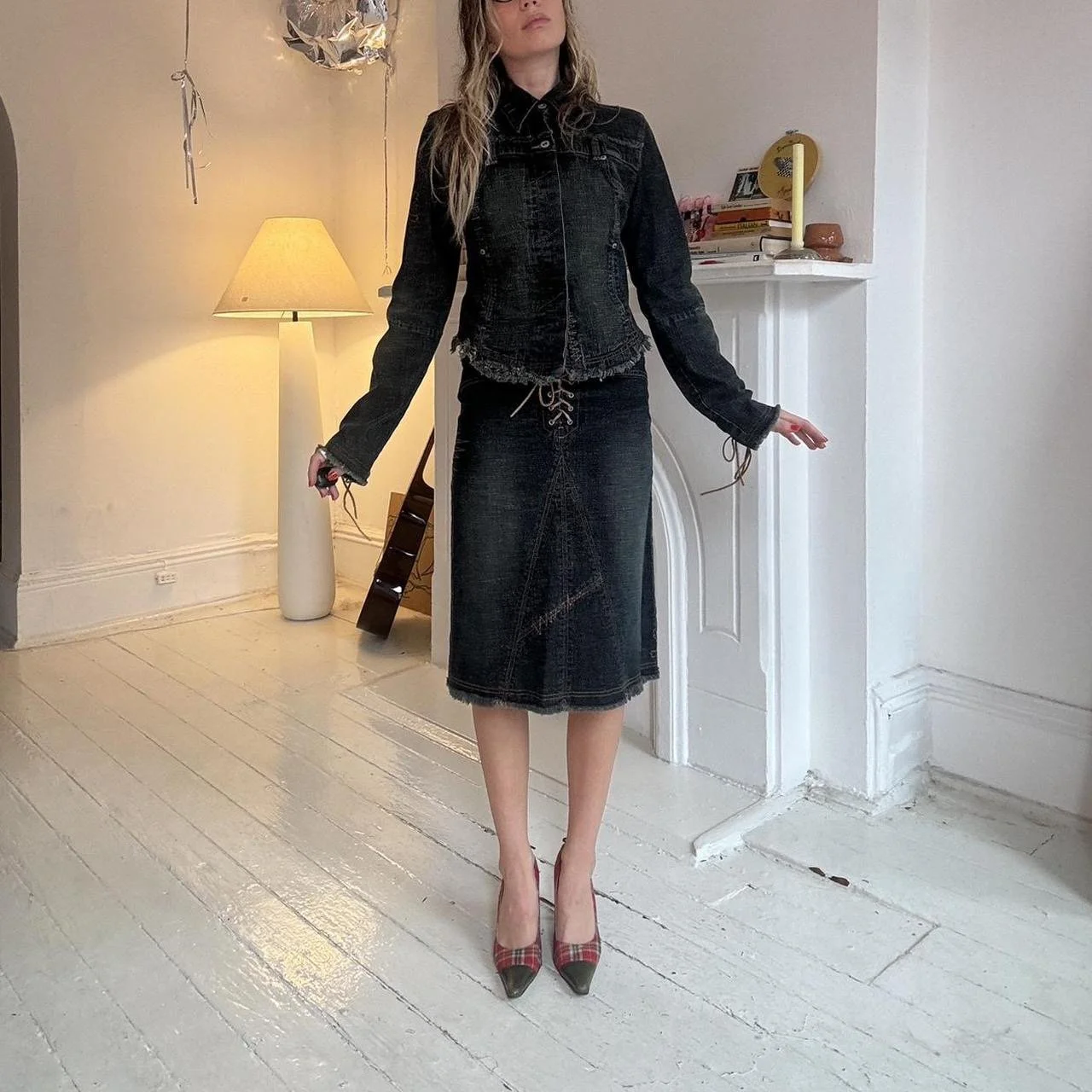 (Size small) Rare Y2K Parasuco denim set - rare early-2000s matching jacket + lace-up midi skirt. Structured fit, frayed hems, contrast stitching