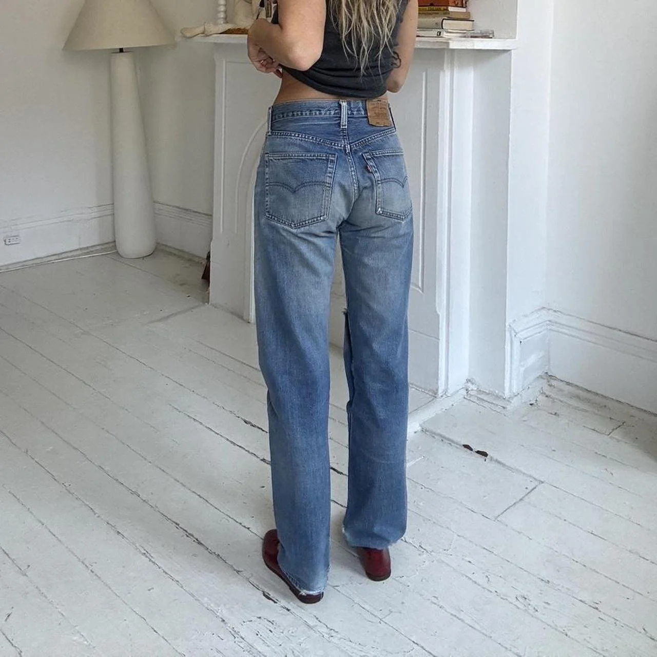 Early 90s Valencia Street factory production with “555” stamped back button. Classic straight-leg 501 fit with authentic fading and natural wear. Knee distress consistent with age.